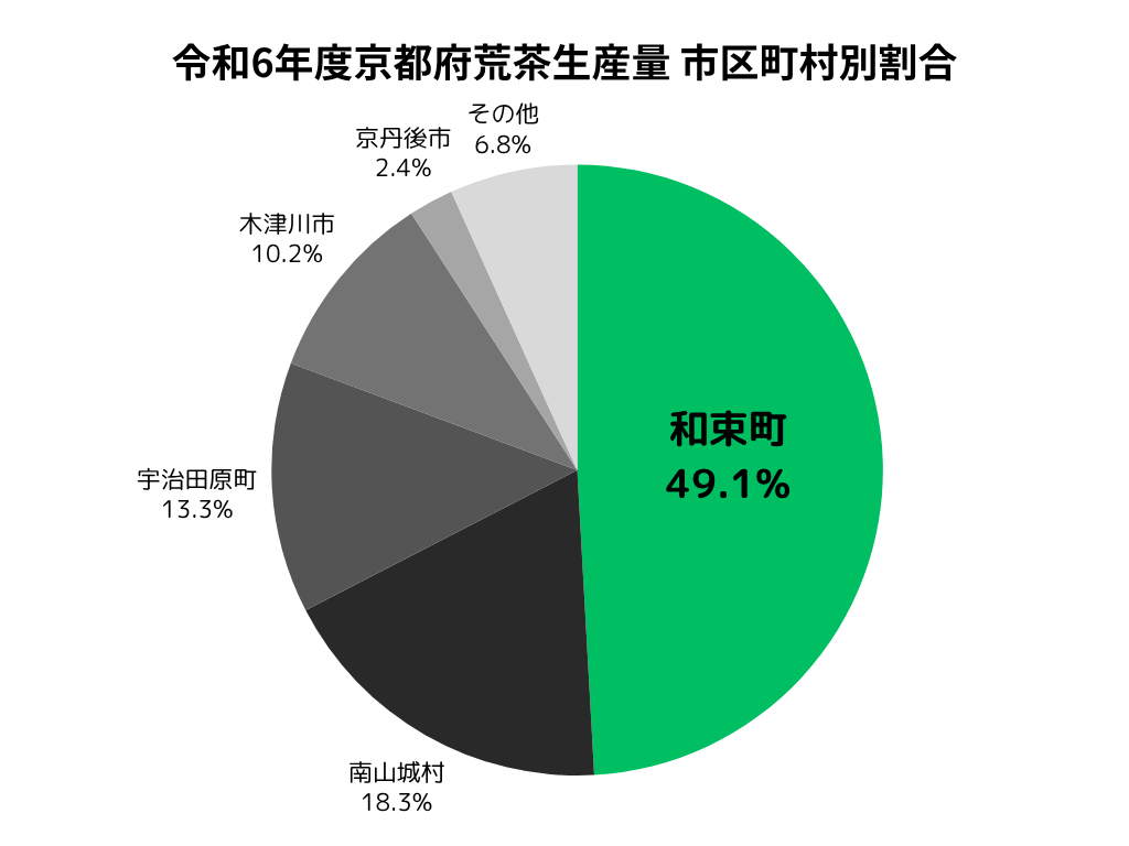 令和6年度では京都府内で生産される荒茶の内、49.1%(約1,224t)を和束町にて生産しています。また、抹茶の原料となるてん茶の生産量では、51.9%(約549t)を和束町にて生産しています。